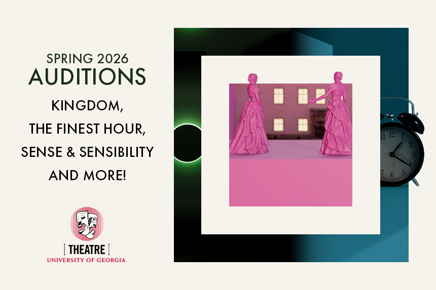 Image: Below you will find information about auditioning for the Spring 2026 leg of UGA Theatre's theatrical season: Kingdom directed by Dr. Vivian Appler, Arwa Abdelrahman's New Georgia Group Award-winning The Finest Hour, and Sense & Sensibility, directed by guest artist Rachel May (Co-founder and Producing Artistic Director, Synchronicity Theatre) In addition to auditions for our seasonal offerings, there will be a button below for those interested in auditioning for First Semester: A Musical, undergraduate Wyn Alyse Thomas's original play and directed by Bianca Cardona that has been selected to perform at this year's Kennedy Center American College Theatre Festival's Region IV in Montgomery, Alabama. FIRST SEMESTER: A MUSICAL Audition Schedule & Preparation Auditions are on Thursday, October 23rd & Friday, October 24th from 5:30 to 9:00 in Room 352. Auditions are open to all UGA students at any level and regardless of major. Fill out your audition information form and submit. All audition forms are due by Thursday, October 23rd, by 1 pm: Spring 2026 audition form Pick a time slot for your audition: Spring 2026 audition time slot Bring 3 copies of your resume & headshot. You will hand these to each director. Have a 1 to 2 minute contemporary monologue with heightened language. Please see the audition notices for any specifics the directors are looking for in the audition. There is a virtual audition option for the 3 mainstage productions. You will upload your video on the audition form. The deadline to upload your virtual audition for the mainstage productions is Thursday, October 23rd, by 1 pm. Callbacks Schedule All students have to be physically present for callbacks. A virtual option is not available. Kingdom callbacks will be held on Sunday, October 26th, from 1 to 5 pm in Room 115. New Georgia's The Finest Hour callbacks will be held on Sunday, October 26th, from 3 to 7 pm in Room 352. Sense & Sensibility callbacks will be held on Monday, October 27th, from 6 to 10 pm in Room 352. First Semester callbacks will be held on Monday, November 3rd, from 6 to 10 pm in Room 115. Audition Notices Kingdom Audition Notice New Georgia Award: The Finest Hour Audition Notice Sense & Sensibility Audition Notice Callback Sides *This information will be updated over the next two weeks. Kingdom The Finest Hour Sense & Sensibility