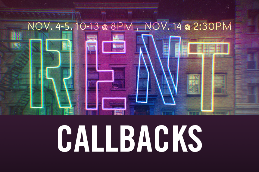 Image: Callback List: Rent Callback Times: August 28 & 29 @ 2:00PM – 5:00PM Room 115 | Fine Arts Building MARK Wyatt Brooks Jack Chavous Jack Dugan Collin Hendley ROGER Wyatt Brooks Marshall Smith Zachary Tate ANGEL Brett Green Aayush Umesh COLLINS Temwa Tshibangu Aayush Umesh BENNY Collin Hendley Houston Boyd Vlandingham MIMI Isabel Arenas Jocelyn Floryance Odai Garrido Siena Miyamura Eva Ramirez JOANNE Kennedi Nichols Mikayla Penn Rachael Simpson MAUREEN Claudia Beroukhim Jacqueline Brooks Caroline Caden Olivia Crerie Rachel Hoover Mikayla Penn Isabel Pruitt FEATURED ENSEMBLE Kendyl Dunn Andrea Ellett Ashtyn Evans Hannah Fordham Eden Franco Hansen Hardin Monroe Harless Emma Hilleary Faith Horton Priscilla Jackson Juliana Mitchell Roni Nash Ciara Pysczynski Sydney Rainwater Mia Reese Lily Robles Sydney Wakeford Morgan Wiese MY-kell Williams Dameco Young If you are able, please print the callback sides and music for the character(s) you are being called back for. CALLBACK MATERIALS: Click Here